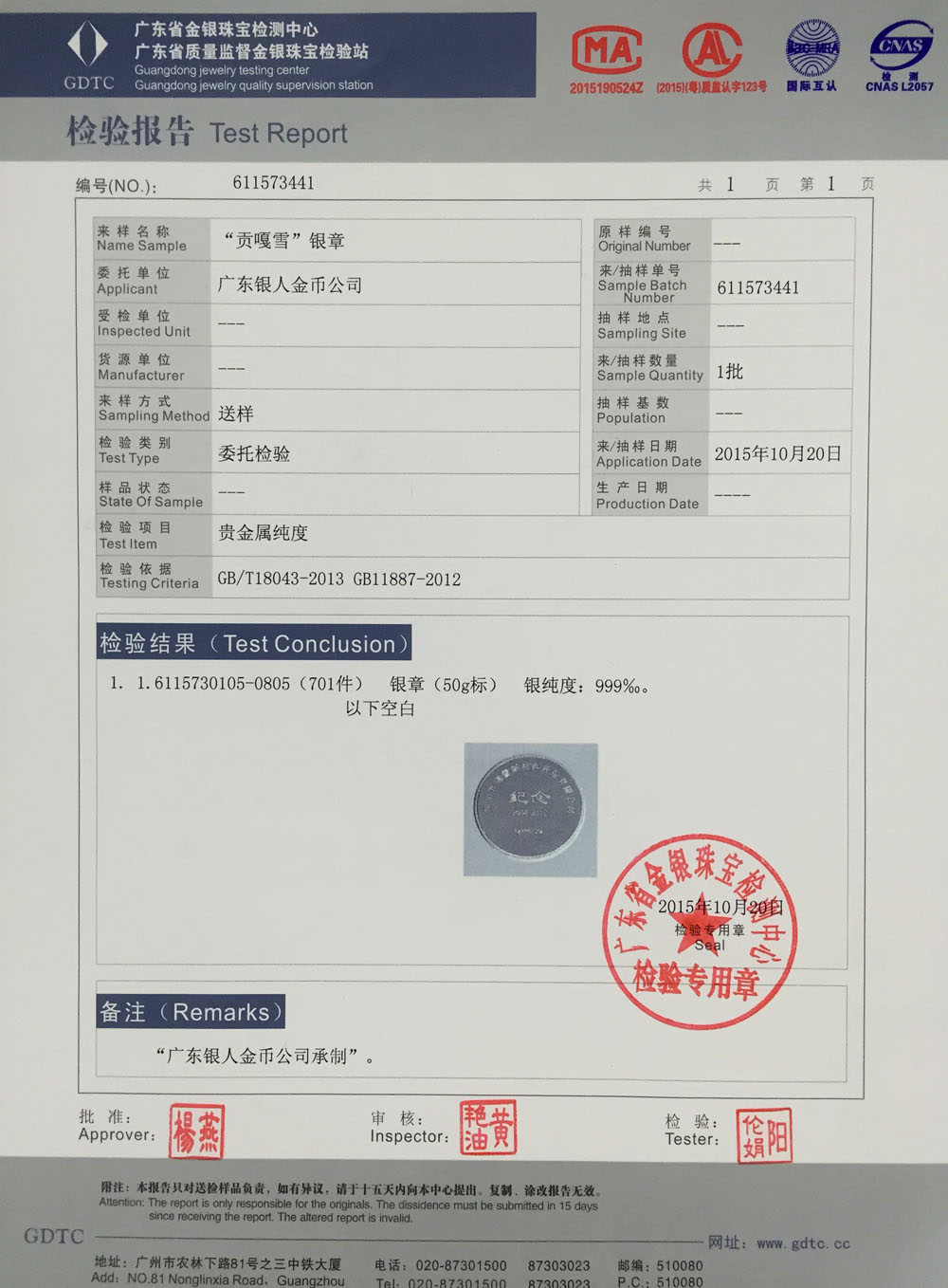 每一款產(chǎn)品均由廣東省質監(jiān)單位進行全面檢測、出具含金量、含銀量、黃金白銀品質、純金純銀重量、金銀紀念幣品相等方面的權威鑒定證書和檢測報告,確保廣東銀人金幣公司的每枚紀念金銀幣的質量。