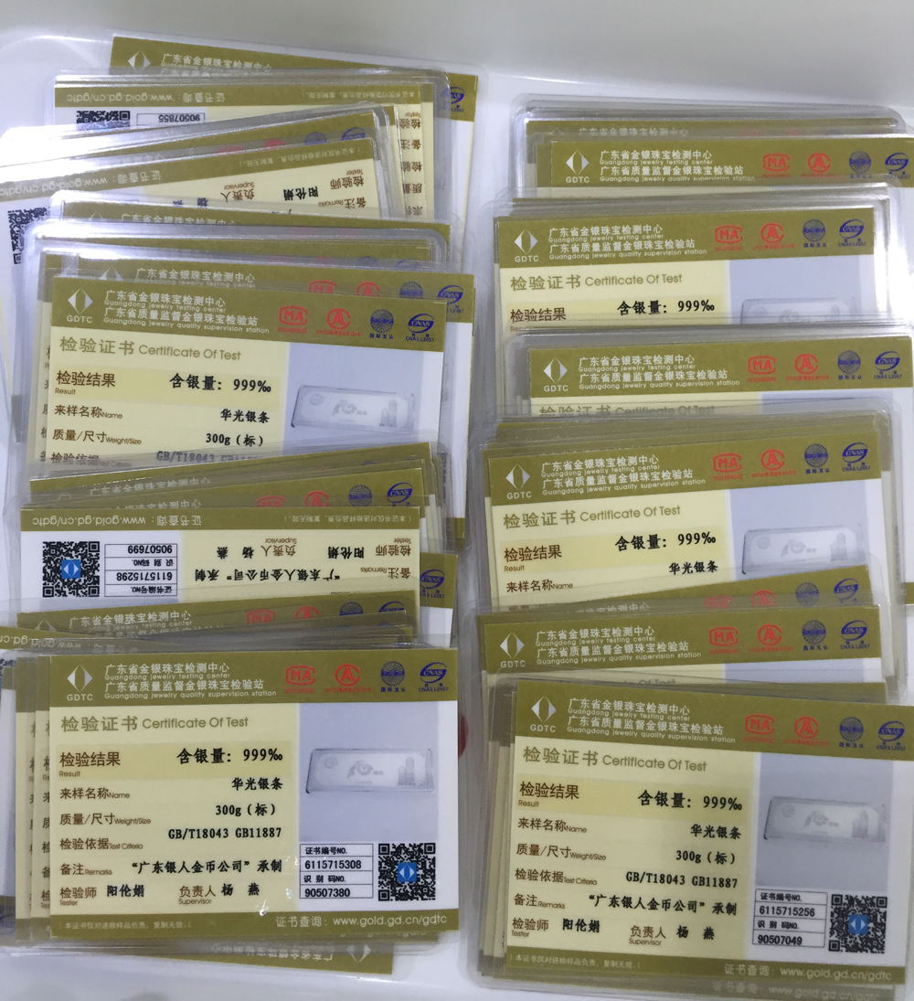 • 廣東省質(zhì)監(jiān)局白銀質(zhì)量含銀量投資銀條銀磚檢測鑒定證書
