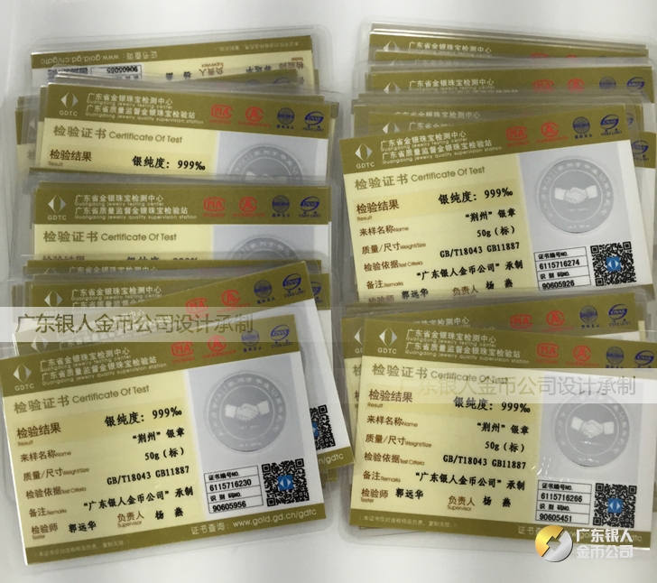 廣東銀人金幣公司承接客戶個性化定制的金銀幣、金銀章、金銀條、金銀牌、金銀盤均由國家質監部門、嚴格檢測、權威鑒定: