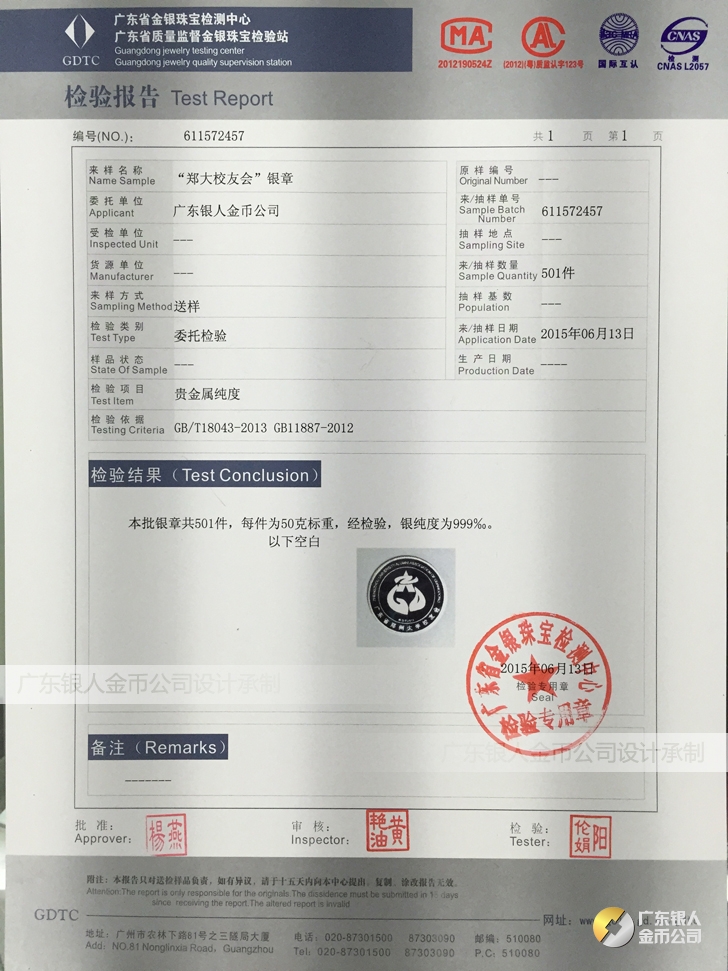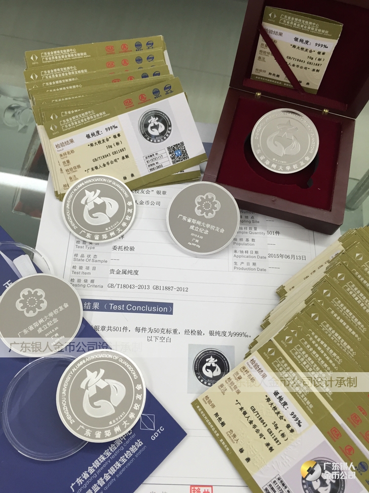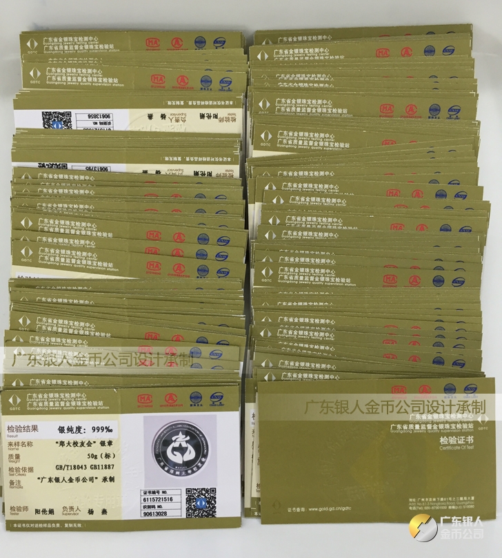 廣東銀人金幣公司承接客戶個性化定制的金銀幣、金銀章、金銀條、金銀牌、金銀盤均由國家質監部門、嚴格檢測、權威鑒定:
