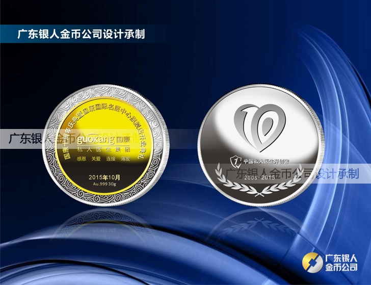 2015年9月定制 深圳國康純銀包金紀念幣定制、純銀鑲純金幣定制