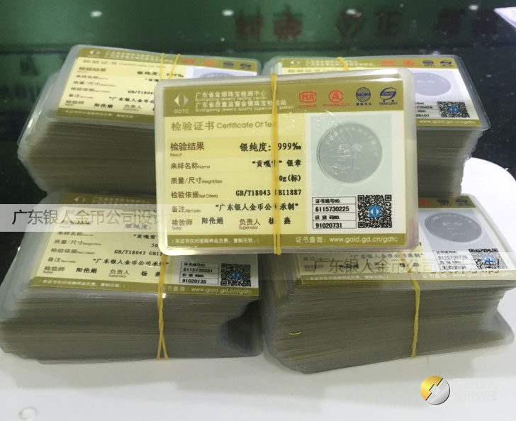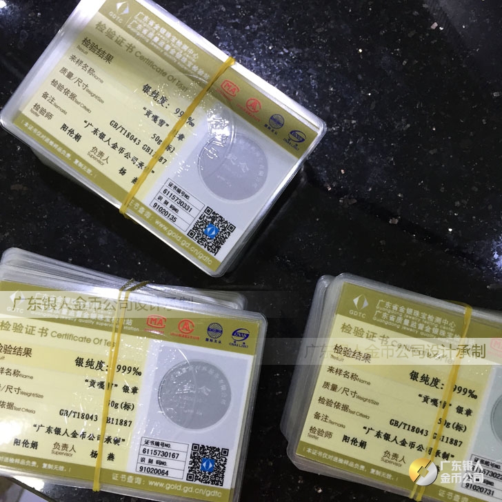 廣東銀人金幣公司承接客戶個性化定制的金銀幣、金銀章、金銀條、金銀牌、金銀盤均由國家質監部門、嚴格檢測、權威鑒定: