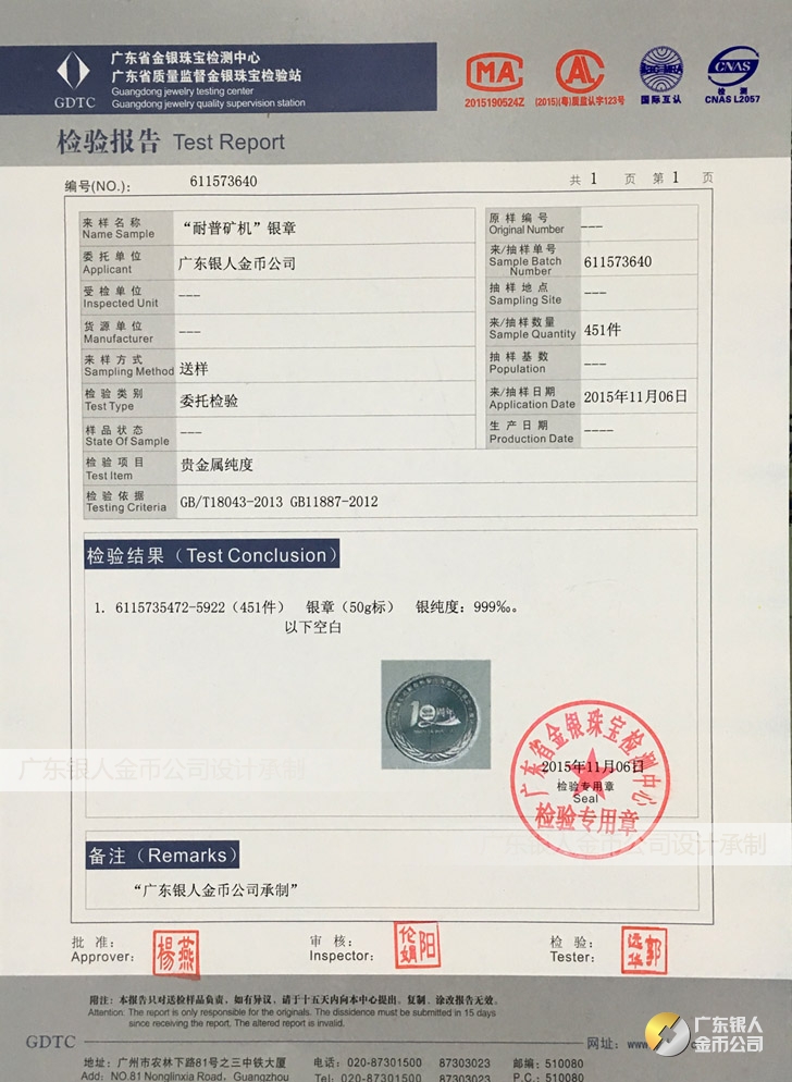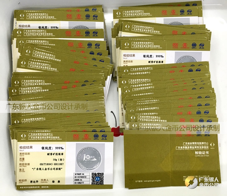 廣東銀人金幣公司承接客戶個性化定制的金銀幣、金銀章、金銀條、金銀牌、金銀盤均由國家質(zhì)監(jiān)部門、嚴格檢測、權威鑒定: