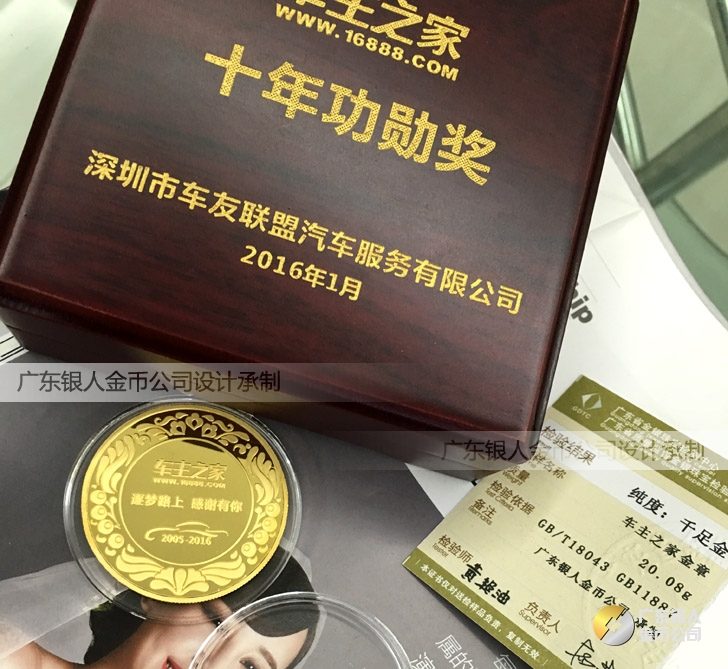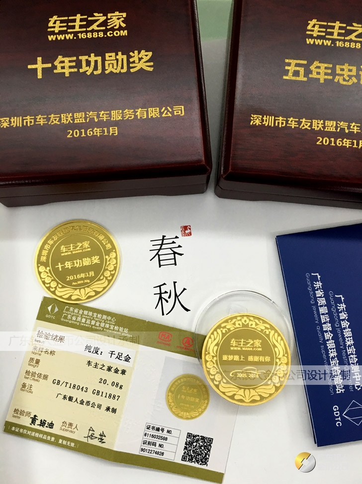 2016年1月生產 深圳車主之家優秀員工純金獎牌生產制作廠家