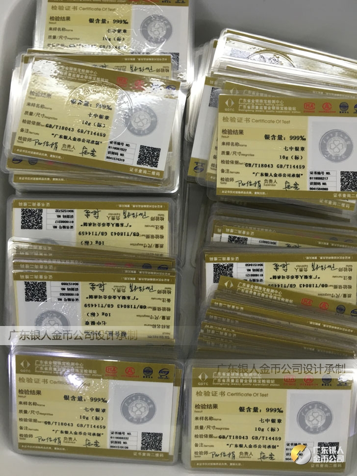 廣東銀人金幣公司承接客戶個性化定制的金銀幣、金銀章、金銀條、金銀牌、金銀盤均由國家質監部門、嚴格檢測、權威鑒定: