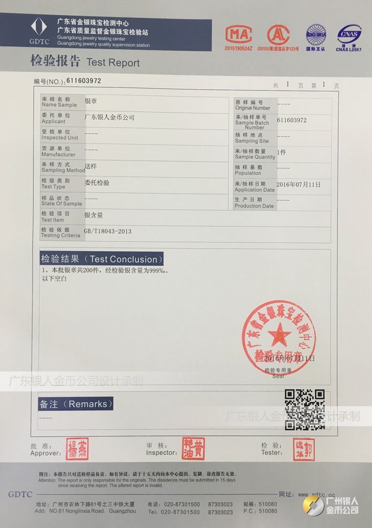 廣東銀人金幣公司承接客戶個性化定制的金銀幣、金銀章、金銀條、金銀牌、金銀盤均由國家質監部門、嚴格檢測、權威鑒定:
