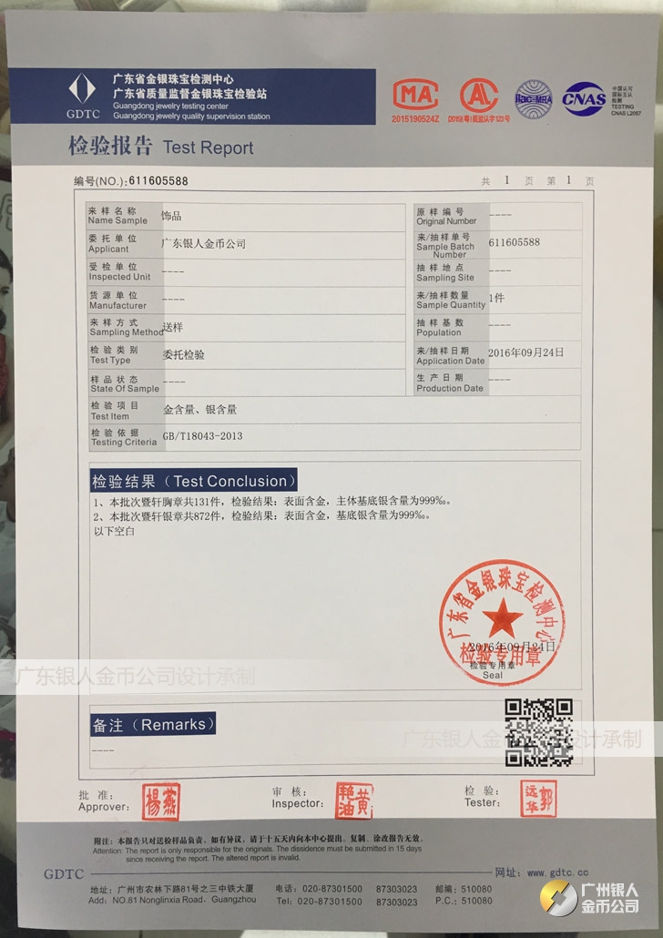 廣東銀人金幣公司承接客戶個性化定制的金銀幣、金銀章、金銀條、金銀牌、金銀盤均由國家質監部門、嚴格檢測、權威鑒定: