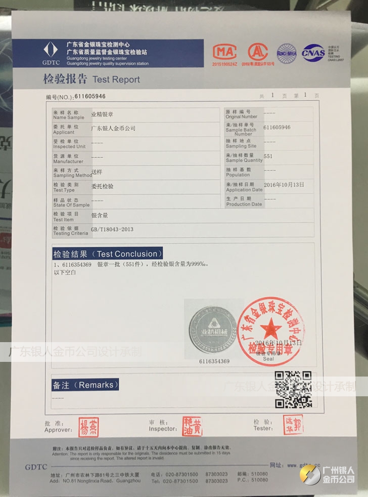 廣東銀人金幣公司承接客戶個性化定制的金銀幣、金銀章、金銀條、金銀牌、金銀盤均由國家質監部門、嚴格檢測、權威鑒定: