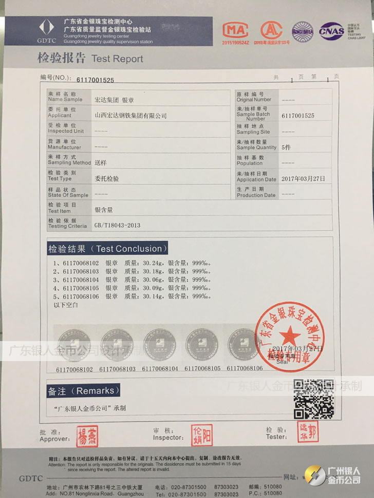 廣東銀人金幣公司承接客戶個(gè)性化定制的金銀幣、金銀章、金銀條、金銀牌、金銀盤均由國家質(zhì)監(jiān)部門、嚴(yán)格檢測(cè)、權(quán)威鑒定: