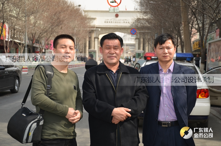 (廣東銀人金幣公司創(chuàng)始人寧帆、居中新疆自治區(qū)人民政府王健處長等工作人員在新疆自治區(qū)政府門口合影留念)
