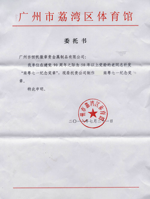 廣州市荔灣區體育局——為該單位制作廣東省委組織部統一標準版50年黨齡老黨員南粵七一紀念獎章。