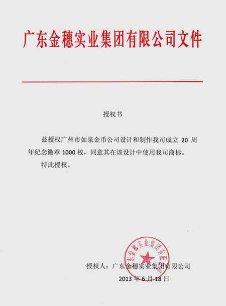 2013年6月:廣東金穗集團成立20周年金質紀念章定做