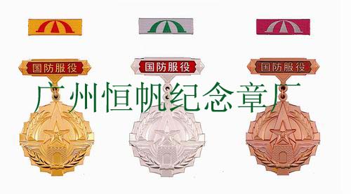 (從左至右分別為國(guó)防服役金質(zhì)紀(jì)念章、國(guó)防服役銀質(zhì)紀(jì)念章、國(guó)防服役銅質(zhì)紀(jì)念章。)