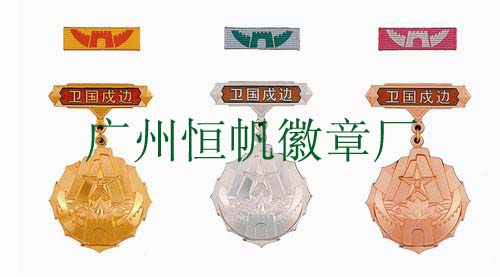 (從左至右分別為衛(wèi)國(guó)戍邊金質(zhì)紀(jì)念章、衛(wèi)國(guó)戍邊銀質(zhì)紀(jì)念章、衛(wèi)國(guó)戍邊銅質(zhì)紀(jì)念章。)