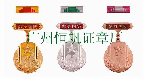 (從左至右分別為獻(xiàn)身國(guó)防金質(zhì)紀(jì)念章、獻(xiàn)身國(guó)防銀質(zhì)紀(jì)念章、獻(xiàn)身國(guó)防銅質(zhì)紀(jì)念章。)