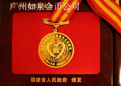 金質獎章每枚均應有掛帶及木質獎章盒(盒子上應印有人名),具體要求參照采購人提供的實物標準。木盒下方字體為“泉州市人民政府 頒發”,下圖為參考樣圖。