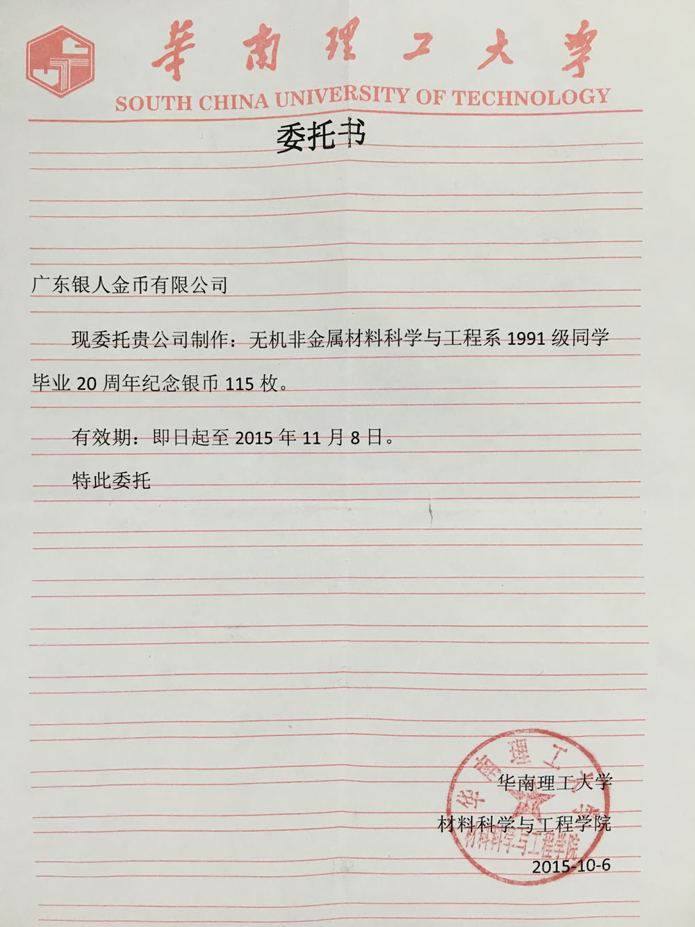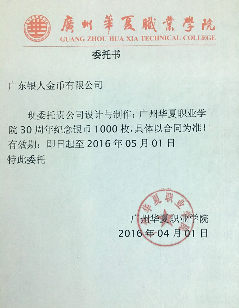 • 廣州華夏職業學院校慶紀念銀幣定制委托書