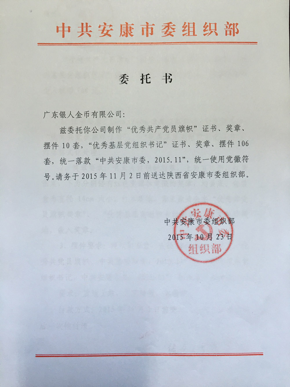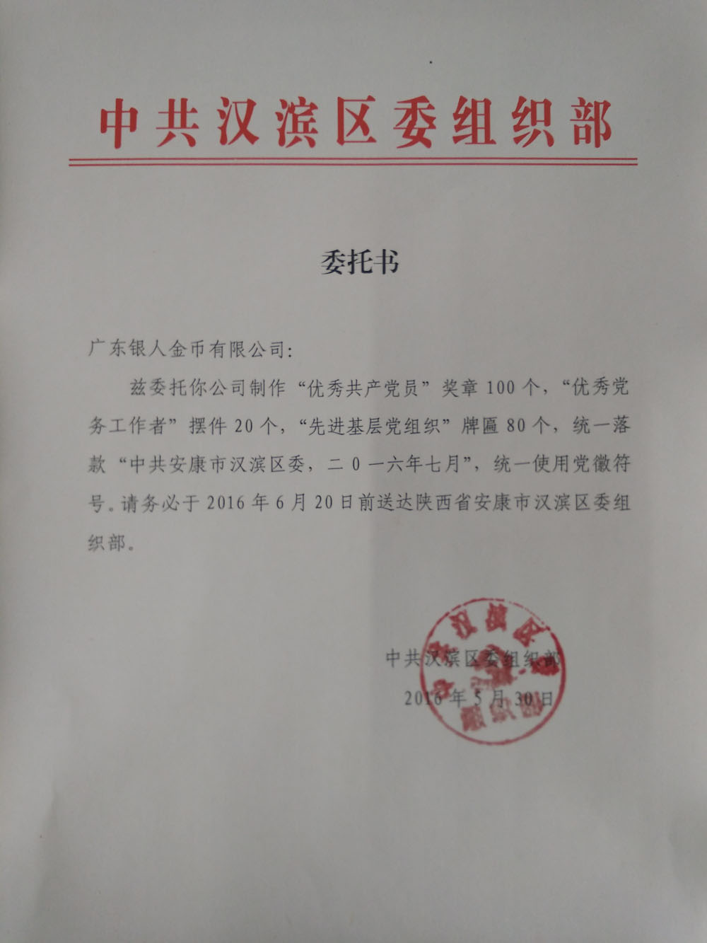 • 中共漢濱區委組織部優秀共產黨員獎章定制公函