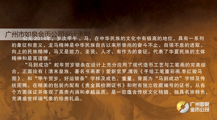 廣州市如泉金幣公司依托上海造幣廠和深圳國寶造幣廠等造幣公司以及金銀制品廠,設計定做紀念幣、紀念章、金銀幣、金銀章、金銀條,采用造幣工藝、選用千足金銀,個性定制金幣、定做銀幣、訂做金條、訂制銀條、制作紀念銀幣、制造紀念金幣、加工紀念銀章、生產紀念金章,純金純銀鑄造、全部國檢、權威檢測。